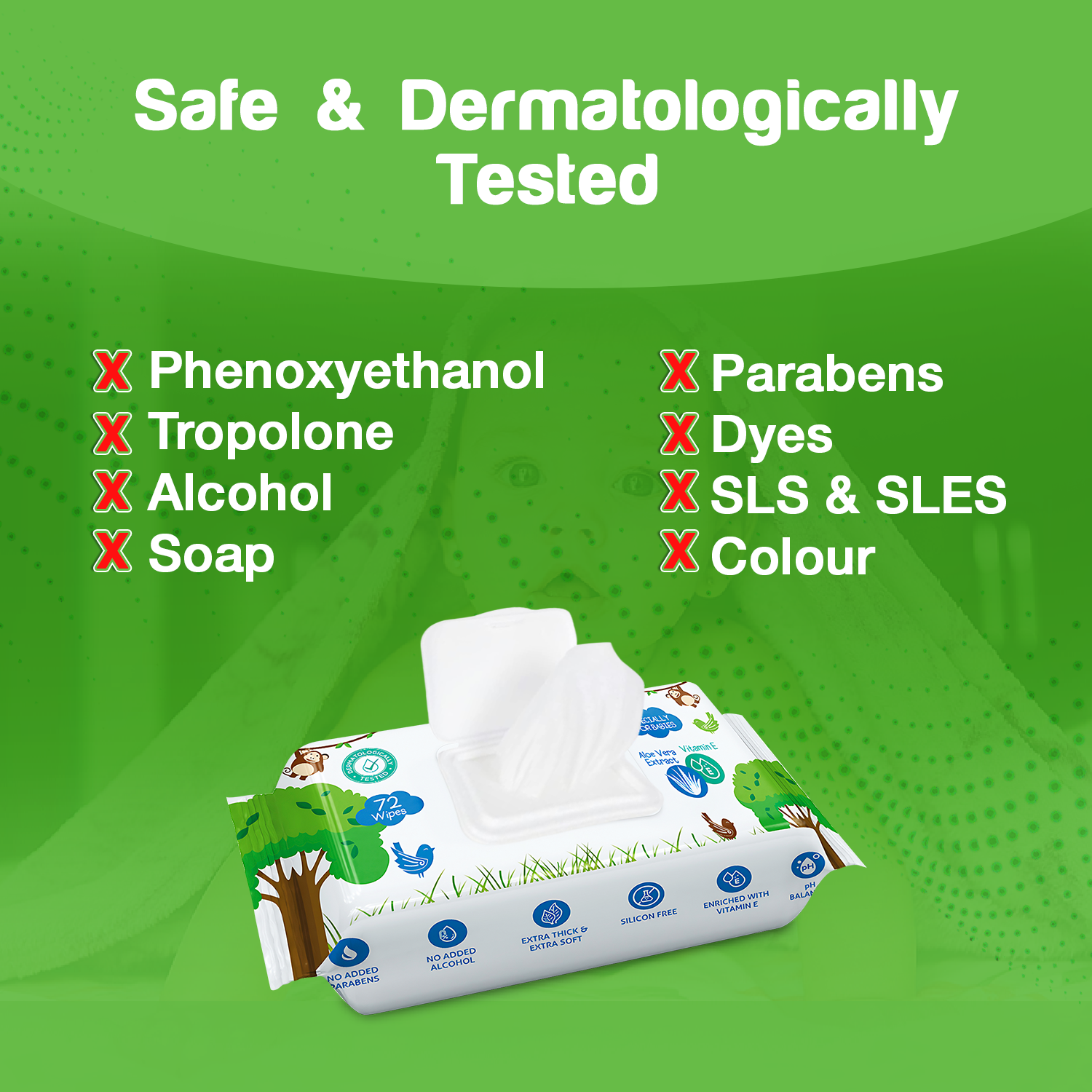 - Nourishing Blend of Aloe Vera & Vitamin E: Our wipes are enriched with a rich blend of Aloe Vera and Vitamin E, carefully selected to neutralize free radicals, rejuvenate, and soften your baby’s delicate skin, promoting healthy and radiant skin.