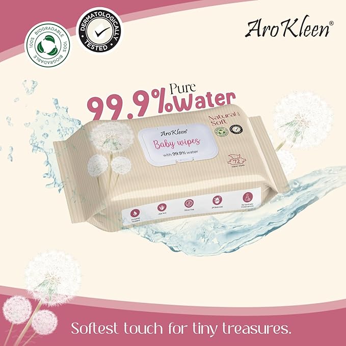 - Natural & Soft: AroKleen 99.99% Pure Water Wipes are made of 100% Natural fabric to give your baby’s skin the delicate cottony soft touch it requires. They gently cleanse the baby’s hands, face, or diaper area without harming their skin and decreasing the chance of skin rashes & irritation.100% biodegradable, thus creating no harm to your babies or to our mother nature.